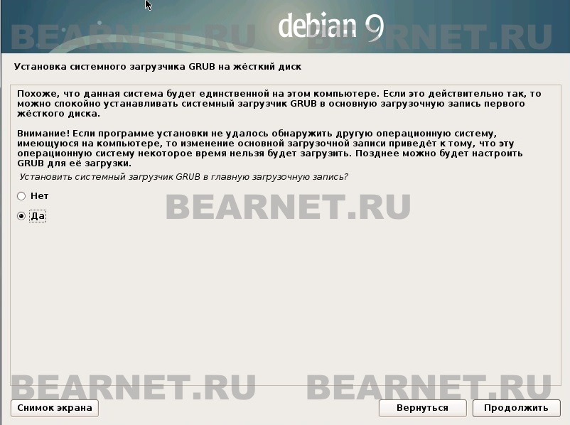 В следующем окне вам предложат установить системный загрузчик. По умолчанию стоит Да, ничего не меняем жмём Продолжить
