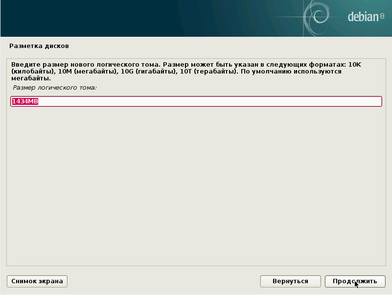Указываем размер. Если вы устанавливаете Debian для того, чтобы посмотреть на него, можно выделить ему и 10 Гб. Но если вы планируете сделать его рабочей системой и у вас есть достаточно свободного места, можно под корень отдать 15/20 Гб. В примере выделим все же 10 Гб. Вы вводите свое значение и жмете “Продолжить”: