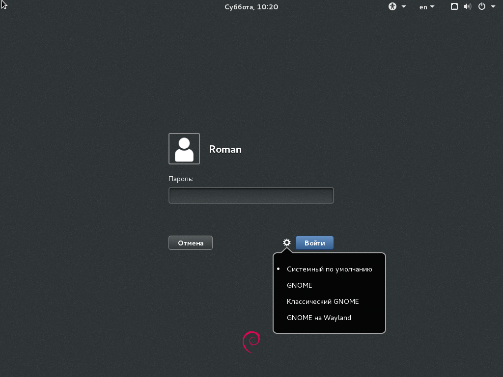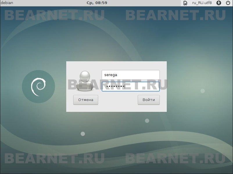 После того, как система загрузится мы увидим окно авторизации для входа в Debian. Вводим логин и пароль которые мы создавали в процессе установки и жмём Войти