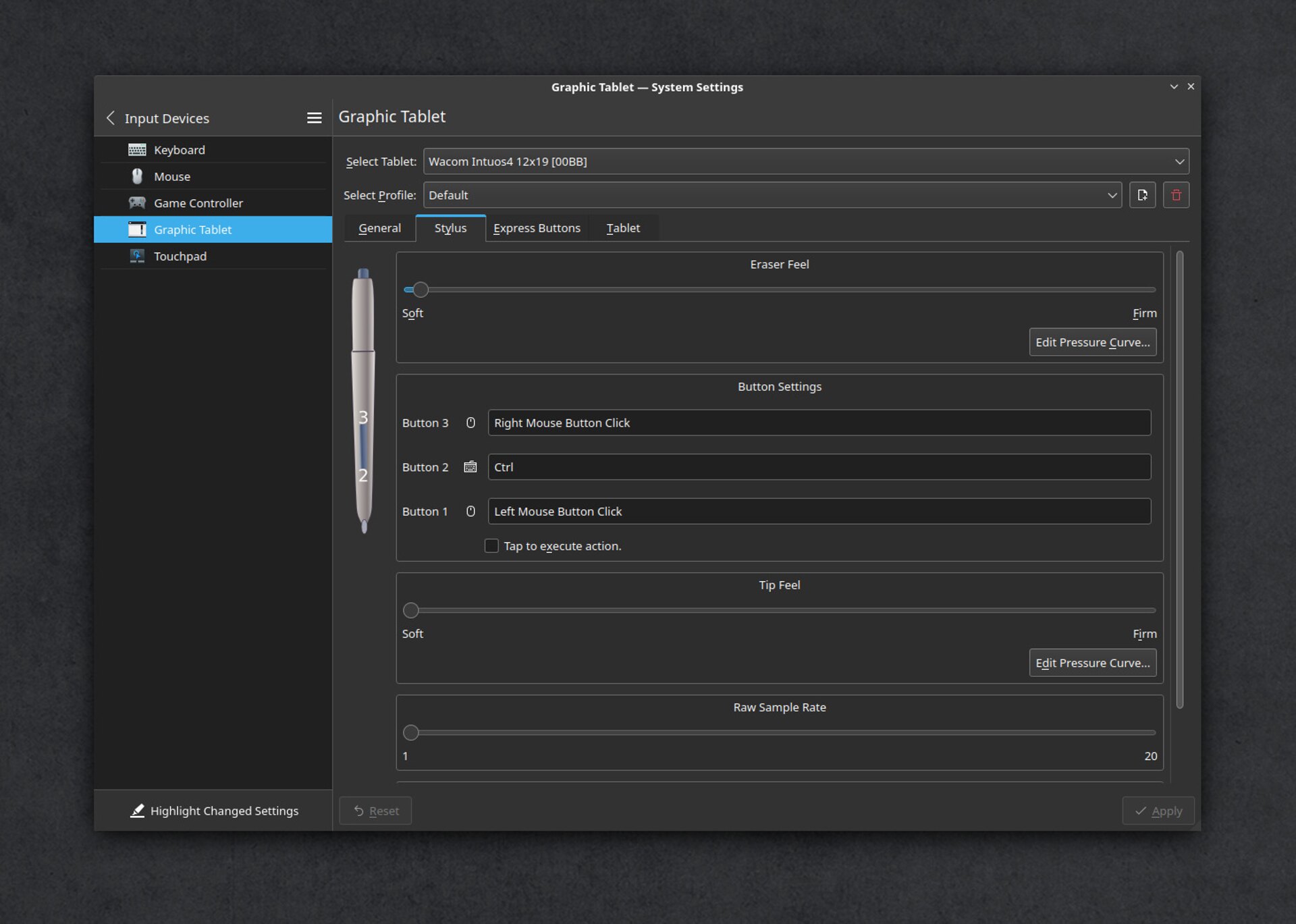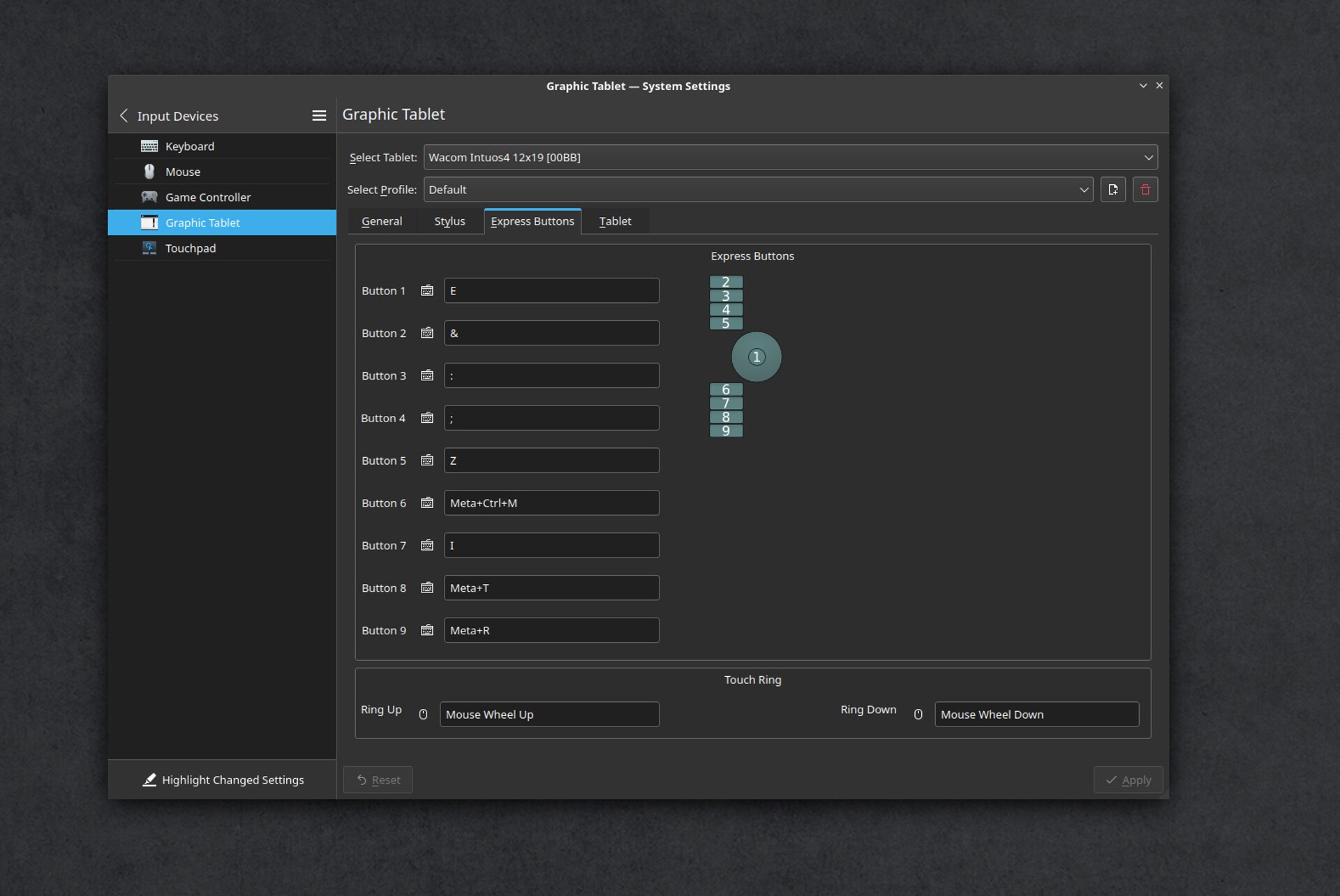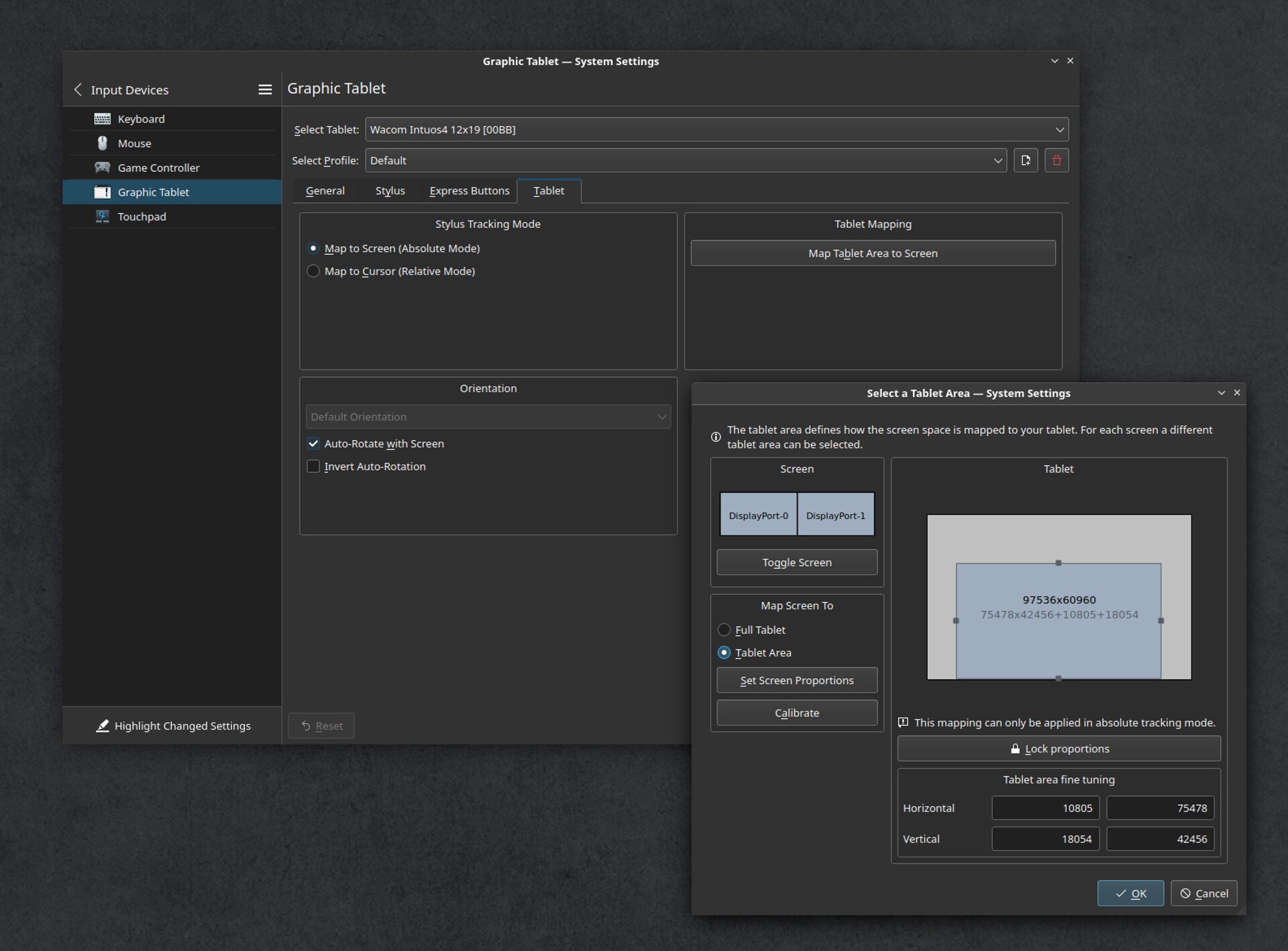 The Plasma desktop under X11 provides a complete tool to setup Wacom’s tablet. You’ll find different setup for the ring, you’ll be able to customise all buttons and also apply a custom area on a specific monitor. You’ll also have access to button to switch monitor and many other conveniences. You can install it with: