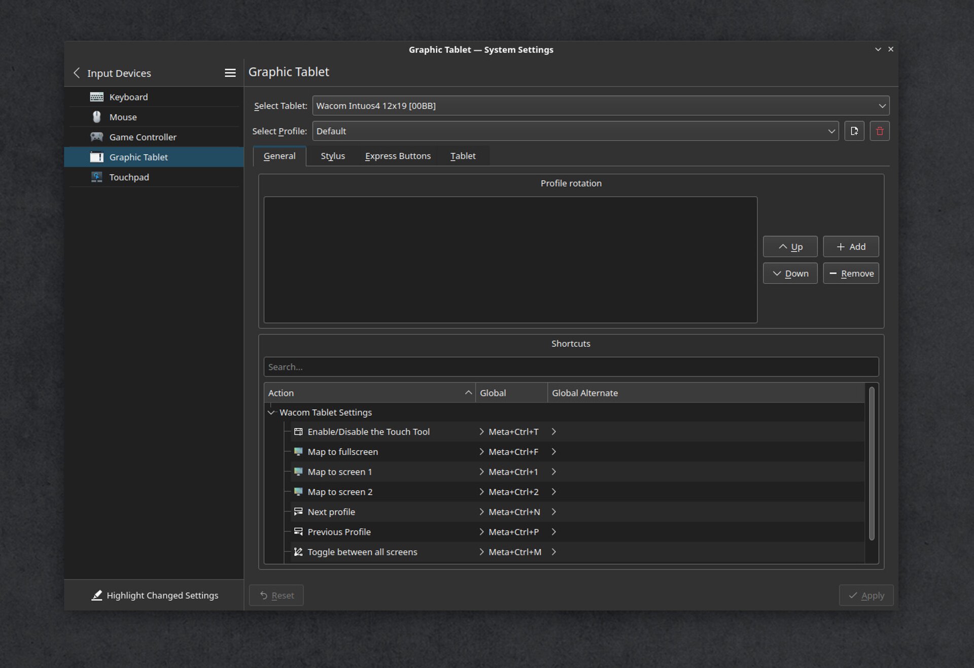 The first panel of the tablet settings, notice the profile rotation to setup multiple configurations.