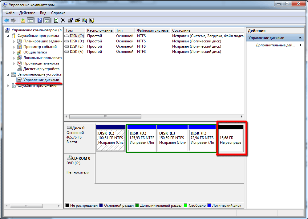 Сначала необходимо зайти в раздел «Управление дисками», переход в который осуществляется кликом по пункту «Управление» в контекстном меню ярлыка «Мой компьютер».