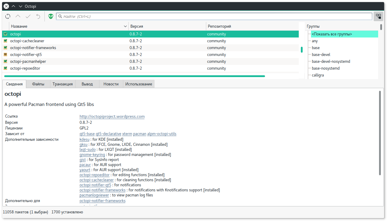 Ставить и удалять софт также можно с помощью графического инструмента. Доступны два варианта: основанный на GTK3 Pamac и базирующийся на Qt Octopi. Оба — графическая надстройка над pacman, менеджером пакетов Arch Linux. В отличие от Octopi, разработкой которой занимаются люди со стороны, Pamac — детище Manjaro Linux, и в том же Arch Linux его можно поставить только из AUR.