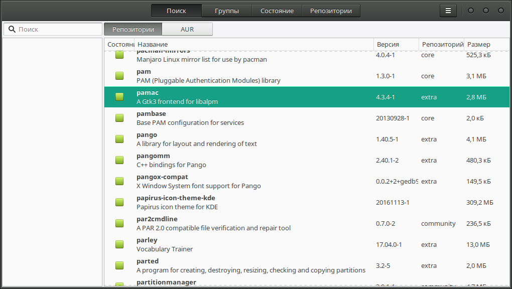 Интересно, что pacman не умеет обновлять систему частично — надо или ставить все обновления, или ни одного. Это следствие философии Arch Linux, для которого и разработали pacman: у пользователя всегда должны быть самые свежие программы. Политика Manjaro несколько отличается — здесь репозитории разделены на 3 ветки: стабильную, тестовую и нестабильную. Если в нестабильной пакеты обновляются сразу, как в Arch, то в стабильную новые версии попадают с задержкой, после их “обкатки”. Так разработчики Manjaro добиваются того, чтобы обновления не причиняли проблем пользователям.