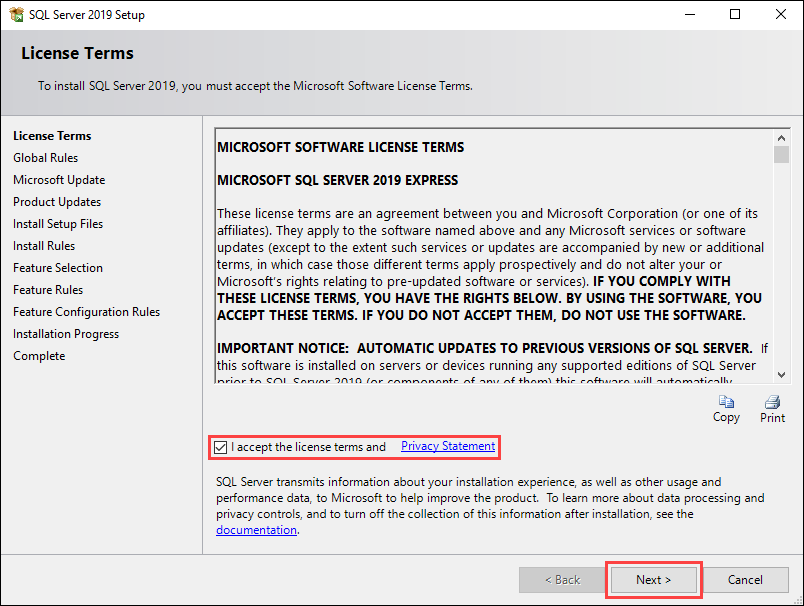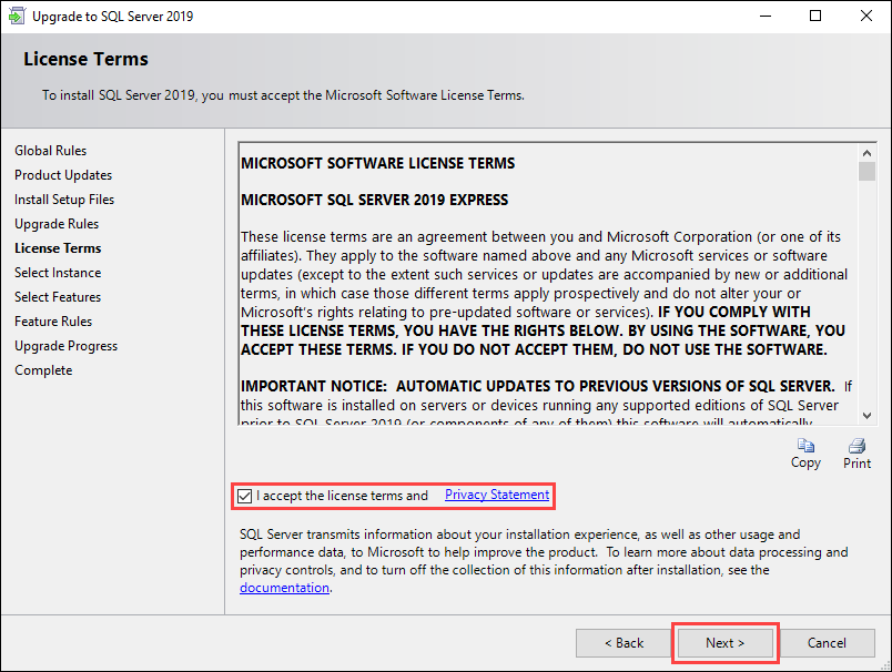 3. Check the box next to I accept the license terms and Privacy Statement and click Next to continue.