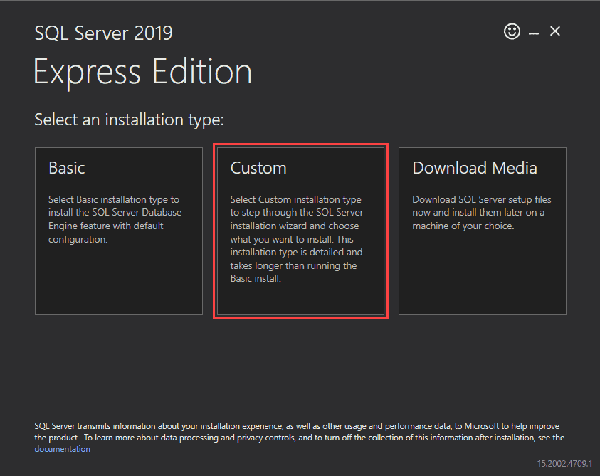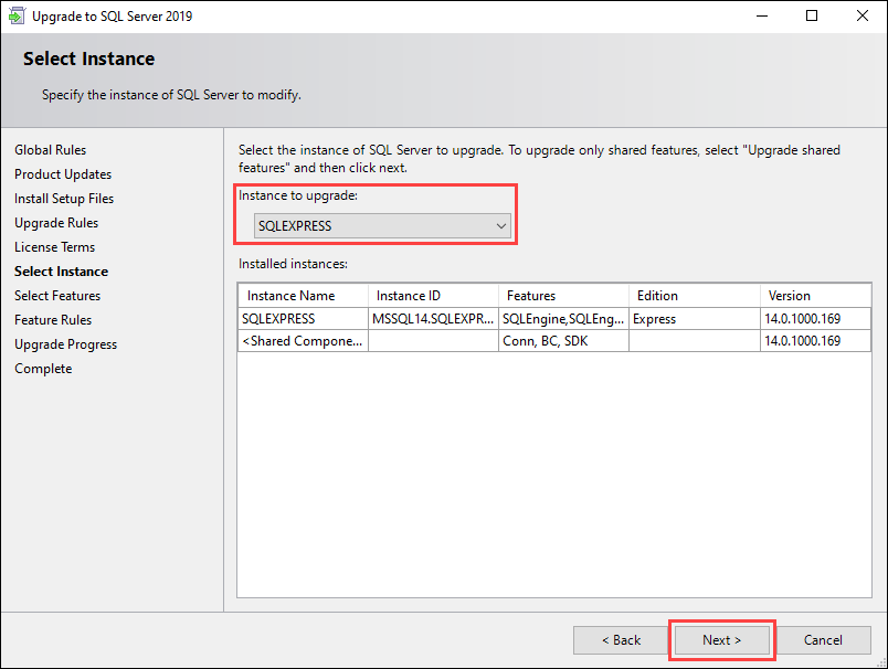 The update process for SQL Server Express is similar to installing the application from scratch. In this example, we are upgrading from SQL Server 2017 to SQL Server 2019: