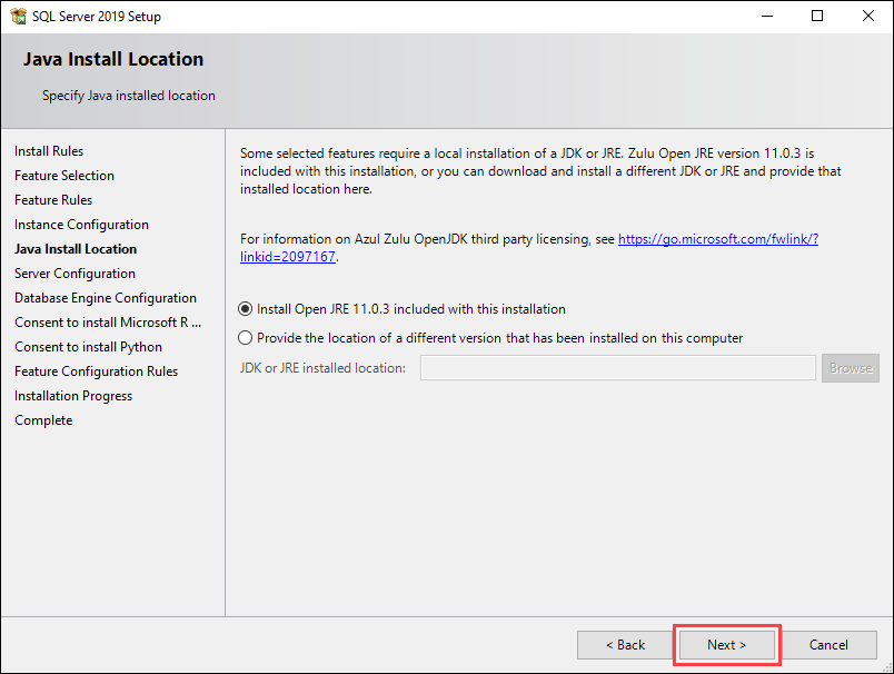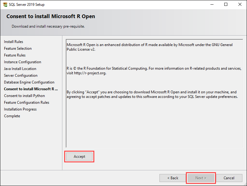 5. Give consent to install Microsoft R Open and Python by clicking Accept and then Next on the following two screens.