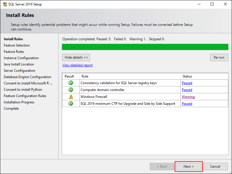 After you have selected MSSQL features you need, the installation wizard will check their compatibility with your system, and if there are no problems, this step will be completed automatically.