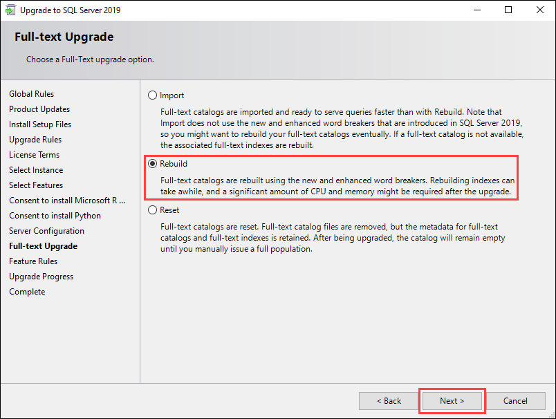 7. The Full-text Upgrade screen offers different options for upgrading your full-text catalogs. Select the Rebuild option and click Next.