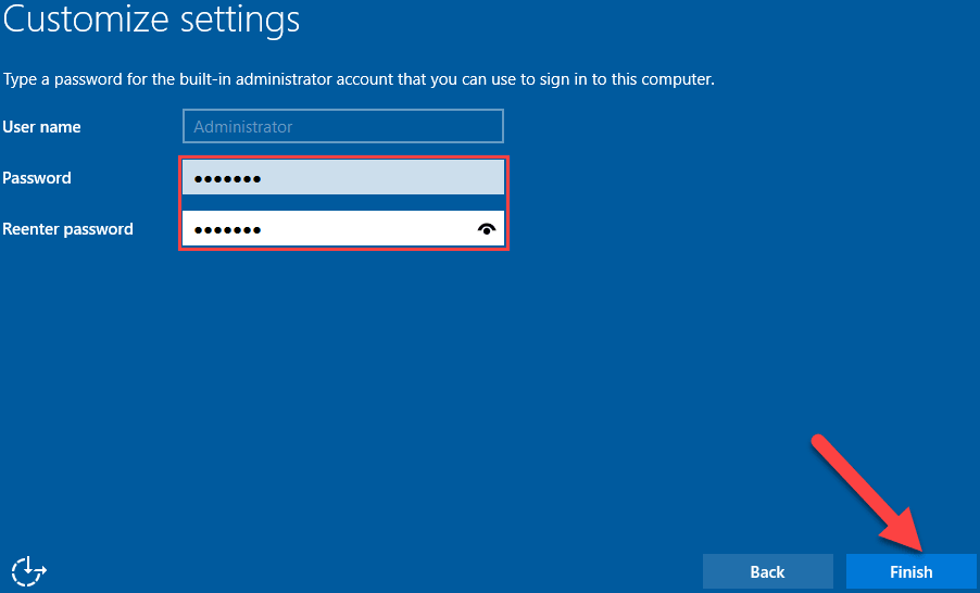После завершения установки и перезагрузки система предложит ввести пароль для учетной записи «администратор» (Administrator) . По умолчанию пароль должен отвечать требованиям безопасности паролей, а именно: