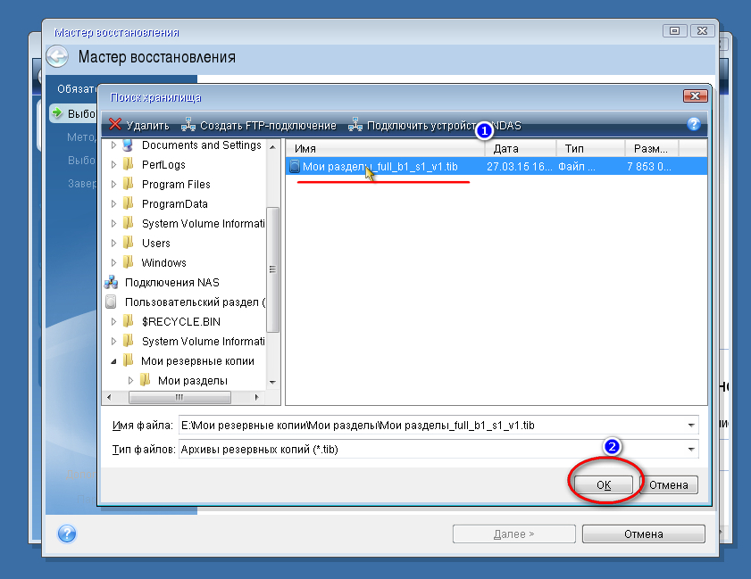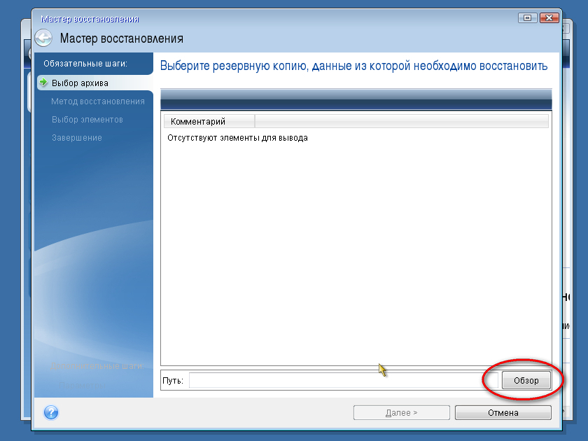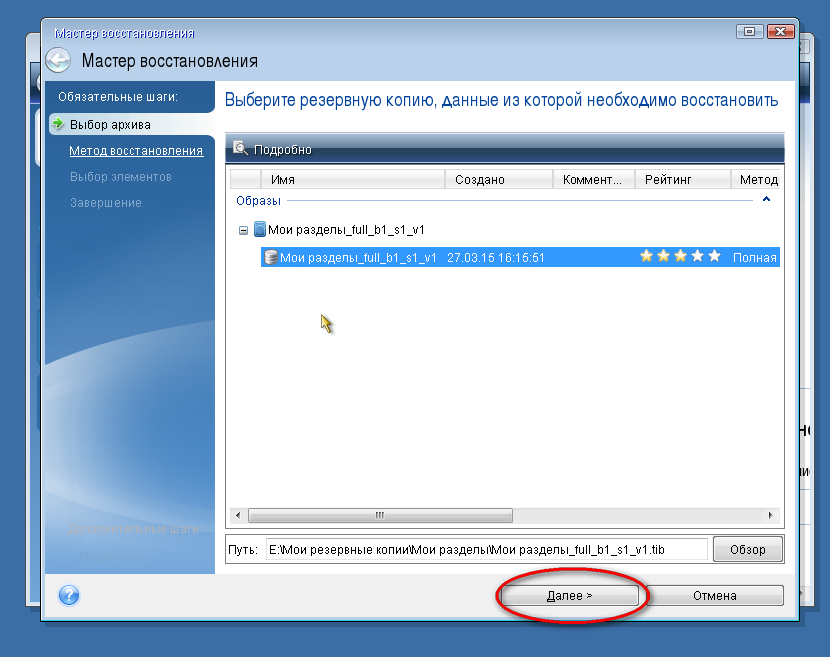 С помощью обзора находим резервную копию в формате TIB, устанавливаем галочки для всех элементов, относящихся к разделу С и опять же следуем указаниям мастера.