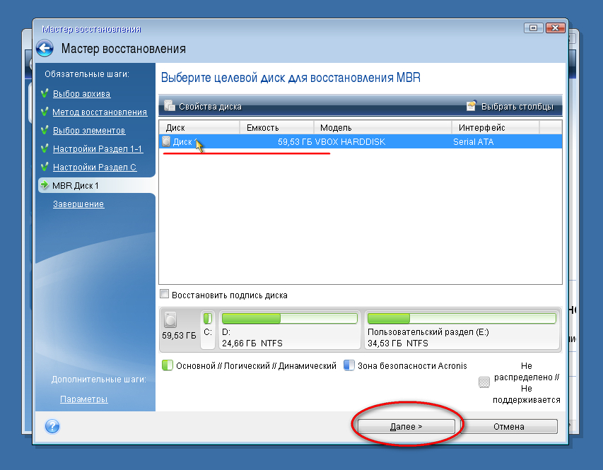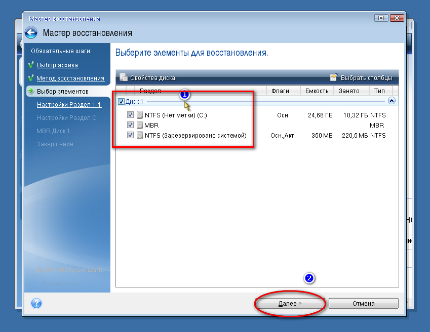 На следующей вкладке отмечаем галочкой два раздела и жмём «Далее». MBR, является главной загрузочной областью. В которой содержится весь список загрузки операционных систем…