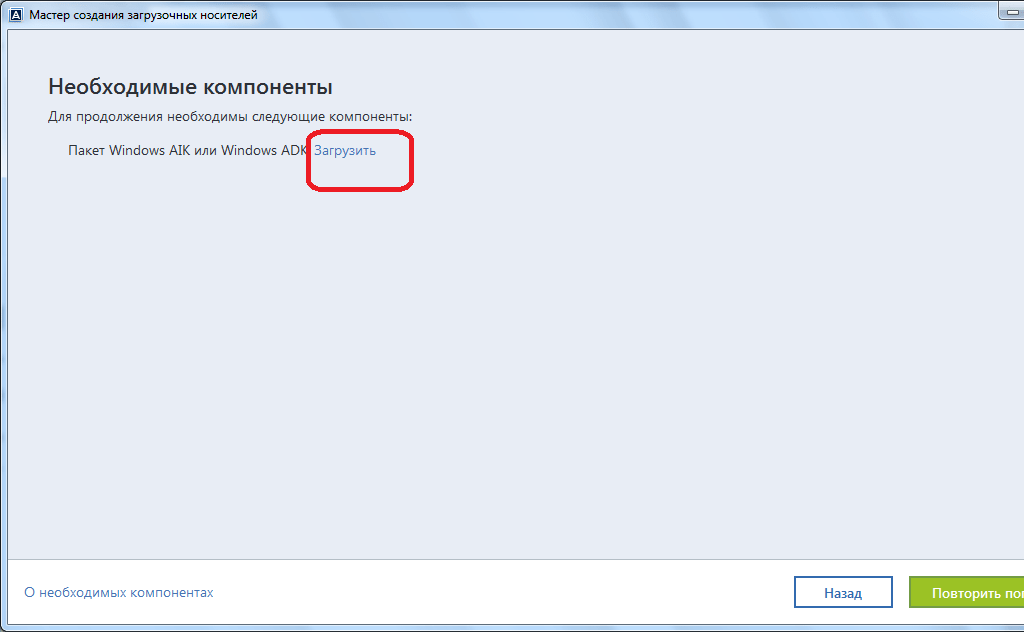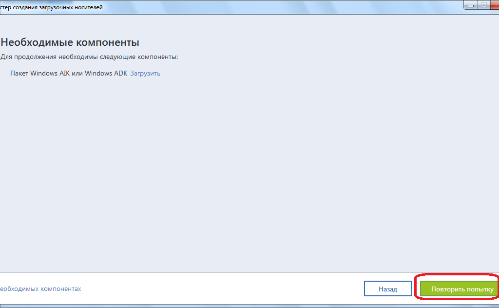 Начинается скачивание и установка требуемого компонента. После инсталляции данного элемента, возвращаемся в окно приложения Acronis True Image, и жмем на кнопку «Повторить попытку».
