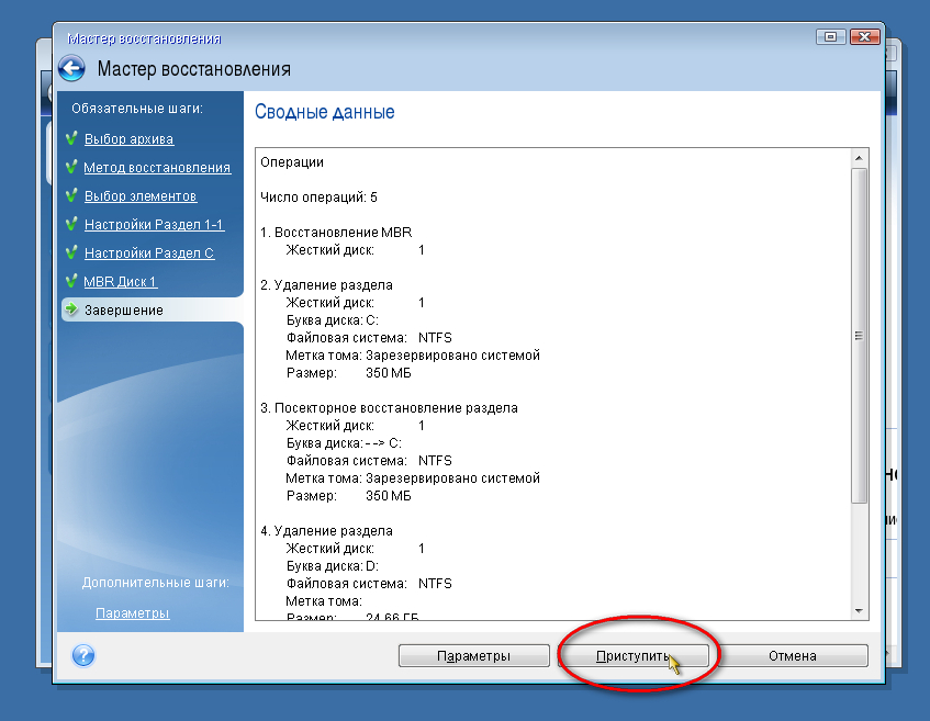 Далее можно посмотреть настройки восстановления. Тут ничего трогать не надо, просто нажмите на кнопку «Далее». Затем Вам будут показаны сводные данные для восстановления, там нажмите на кнопку «Приступить». Начнется операция по восстановлению системы. Наблюдать за ходом выполнения операции вы сможете в соответствующем окне. После успешного выполнения операции программа сообщит вам, что Операция «Восстановление» успешно завершена.