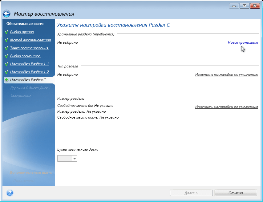 Примечание . Если разделы будут отличатся от исходного размера, например после переустановки системы и переразметки дисков, вам потребуется указать новое хранилище.