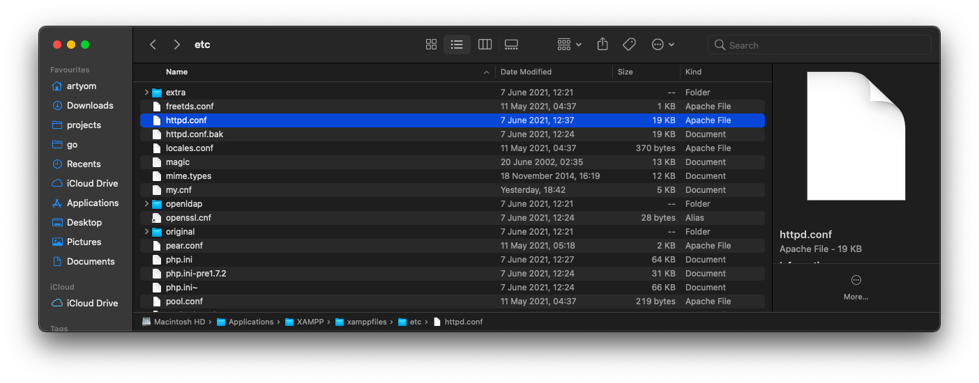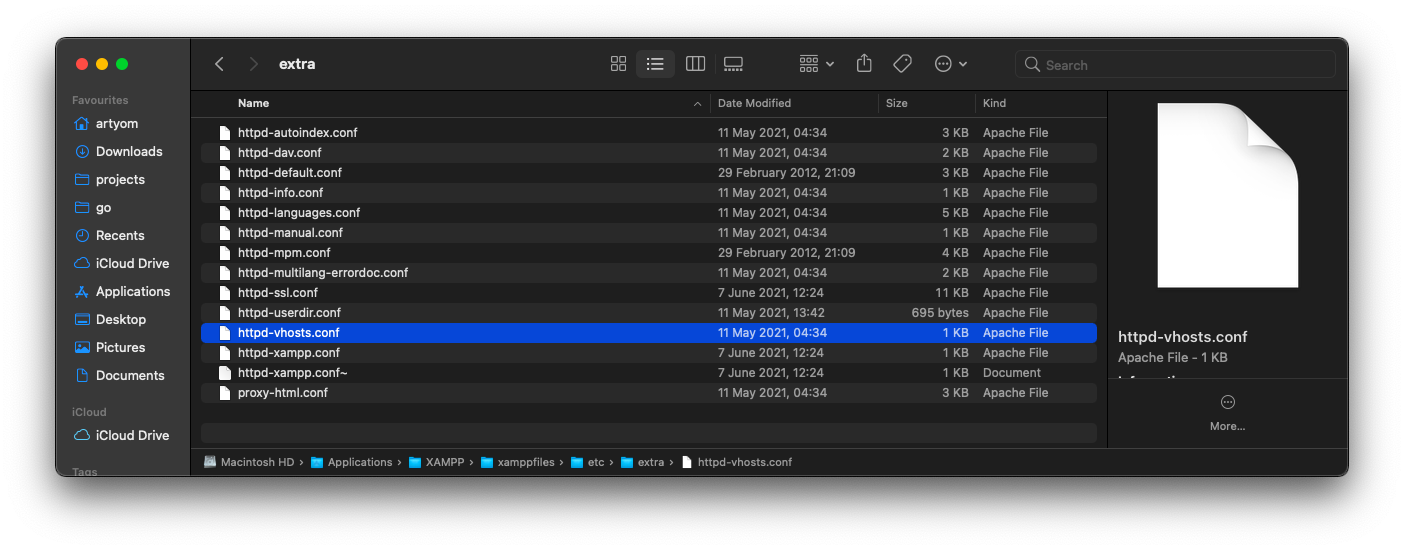 Теперь нужно открыть папку с установленным XAMPP (у меня она расположена по пути /Applications/XAMPP), в ней найти папку etc, внутри нее будет папка extra, а в ней будет файл httpd-vhosts.conf