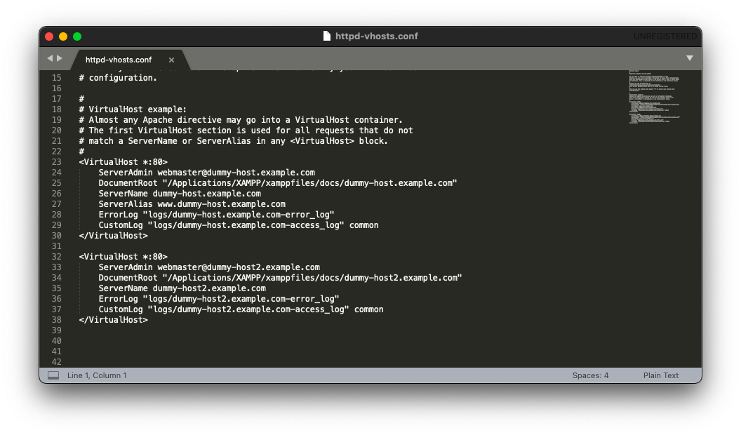 Откройте его в любом текстовом редакторе. В нём вы увидите примеры нескольких конфигураций виртуальных хостов. В моём случае это хосты dummy-host.example.com и dummy-host2.example.com