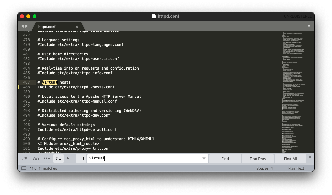 Открываем его в любом текстовом редакторе, и ищем строку:Include etc/extra/httpd-vhosts.conf