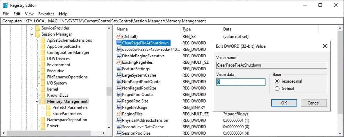 - На правой панели выберите место ClearPageFileAtShutdown И откройте его. Если данные о стоимости 1 , это означает, что настройка включена и может задержать процесс закрытия.