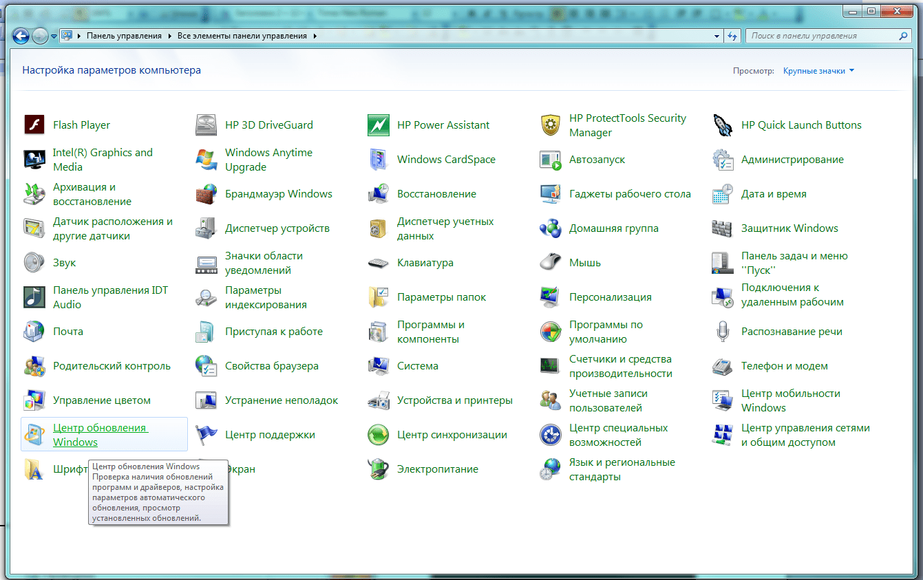 В появившемся большом окне «Все элементы панели управления» ищем вкладку «Центр обновления Windows».