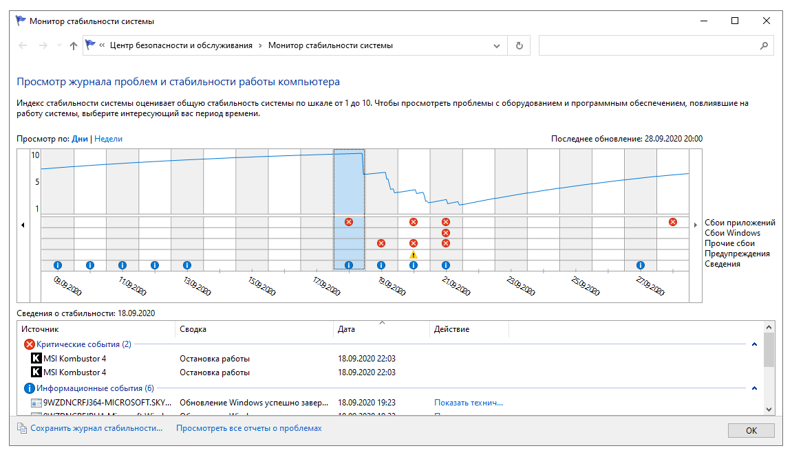 Если этот вариант не помог, можно использовать график для анализа того, какие приложения и обновления были установлены перед началом зависания компьютера.