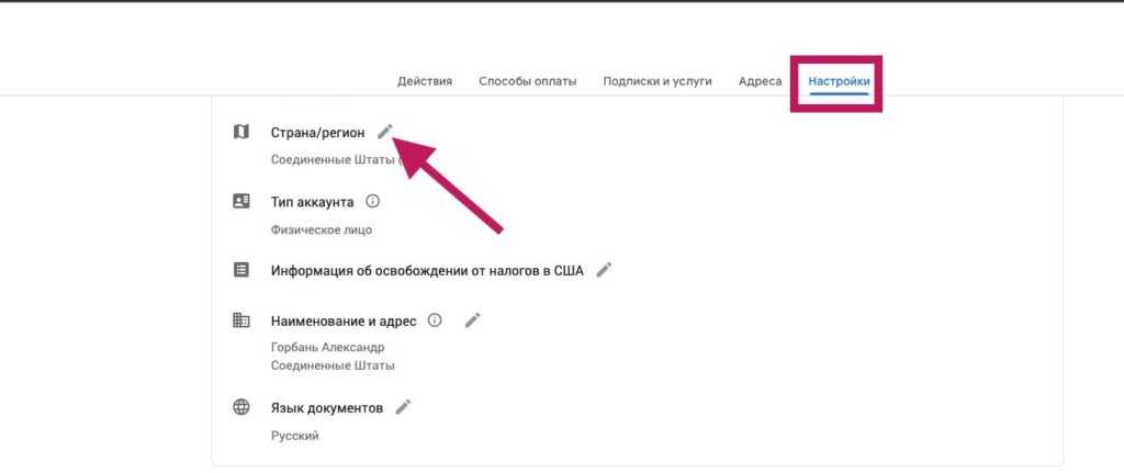 В браузере перейдите на страницу pay.google.com, затем Настройки -> Платежный профиль . Рядом с пунктом «Страна/регион» нажмите «Изменить» (значок карандаша).