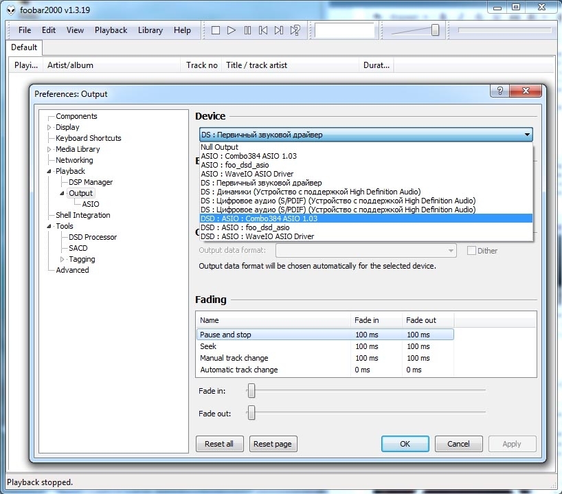 - Выберите: File > Preferences -> Playback -> Output -> Device и выберете DSD : ASIO : Combo384 ASIO 1.0х.