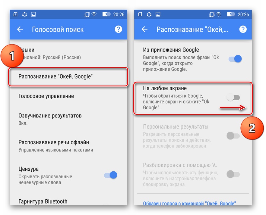 - Настройки -> Голосовой поиск -> Распознавание «О’кей Google».