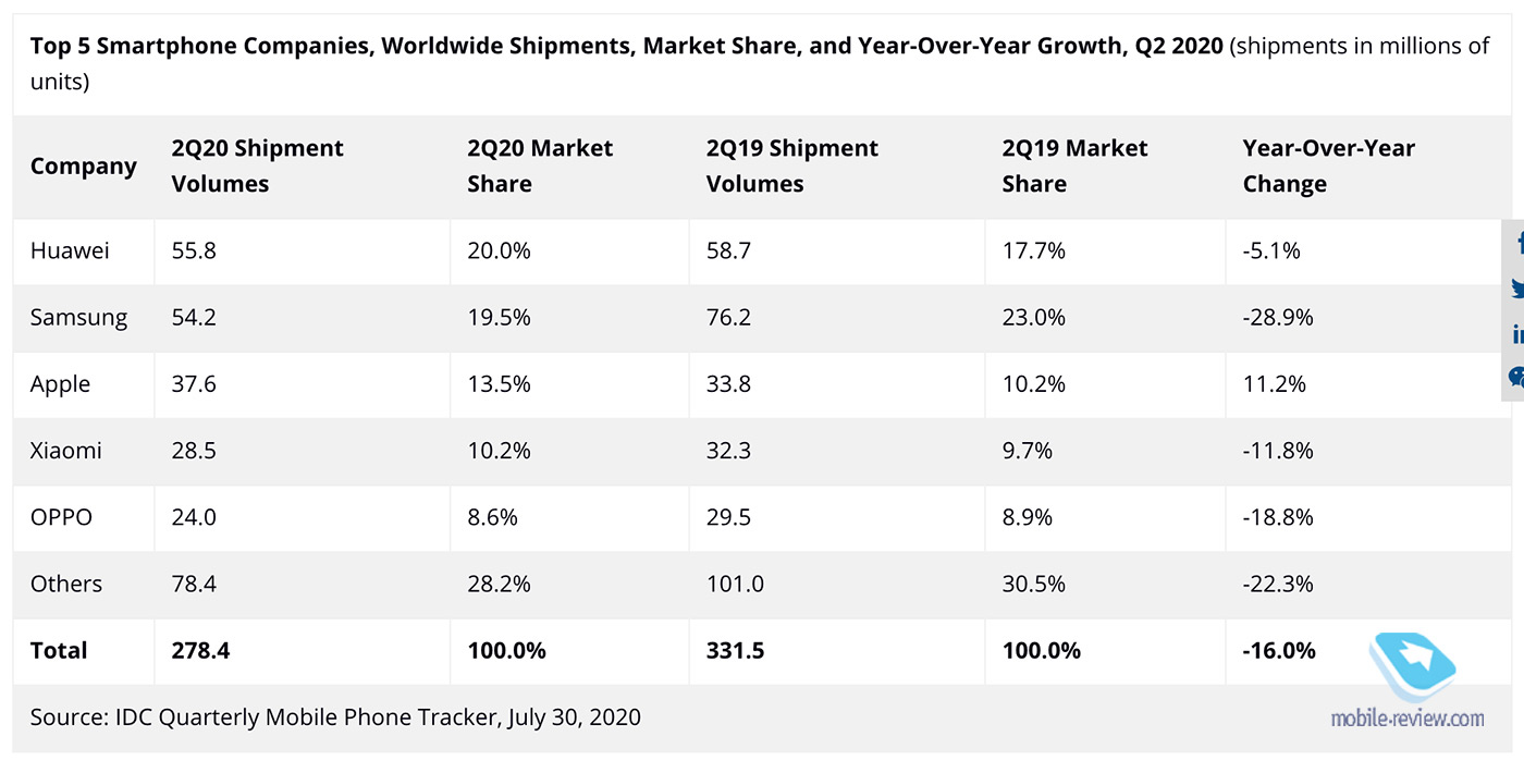 Компания Huawei последние годы росла в продажах смартфонов по всему миру, постепенно отъедала долю рынка у всех прямых конкурентов. Ко второму кварталу 2020 года, несмотря на американские санкции, компания заняла первое место в штучном выражении среди всех производителей.