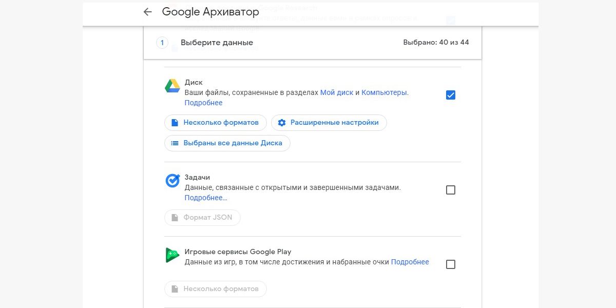 Откроется Google Архиватор. Здесь отобразятся используемые продукты Google, которые хранят ваши данные. Если вам не нужны данные из всех сервисов, отметьте флажками только актуальные. В некоторые продуктах Google можно выбрать конкретную информацию, которую нужно скачать.