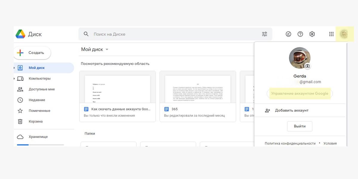 Как скачать данные с Гугл аккаунта: кликните по аватарке, нажмите «Управление аккаунтом Google»