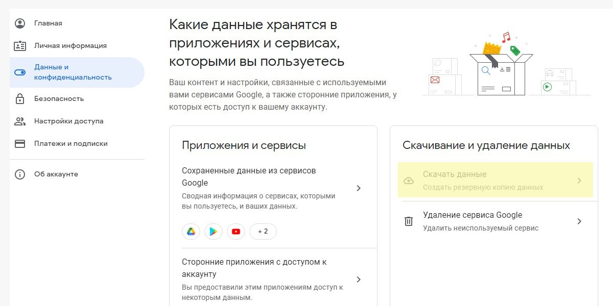 Как попасть на страницу управления данными и конфиденциальностью и скачать данные Гугл Диска на компьютер