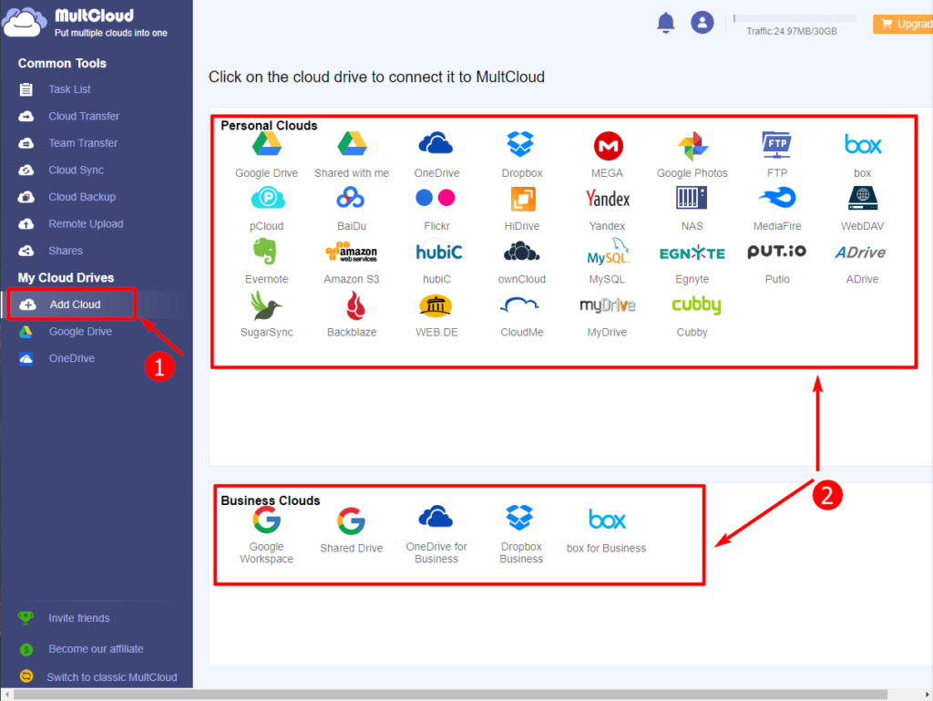 MultCloud – комплексный сервис для эффективного использования облачных хранилищ и сопутствующих функций: копирование, удаление и работа одновременно с несколькими площадками. Принцип использования сервиса вполне простой и понятный, а выполнение поставленных задач потребует всего лишь несколько минут. Правда, в этот раз вам вновь предстоит столкнуться с ограничением скорости до 2 Мбит. А чтобы этот нюанс не сильно расстраивал, разработчики предлагают два приятных бонуса: