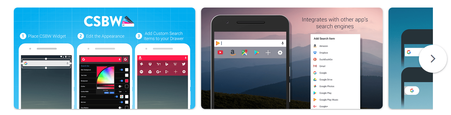 Приложение, которое мы собираемся использовать, называется «CSBW Custom Search Bar Widget», и это один из лучших вариантов (исходя из количества загрузок и положительных отзывов). Это приложение имеет в нашем распоряжении параметры для настройки панели с темой или панелью запуска устройства, различными поисковыми системами и более простыми вещами, такими как вырезание, копирование или вставка слова.