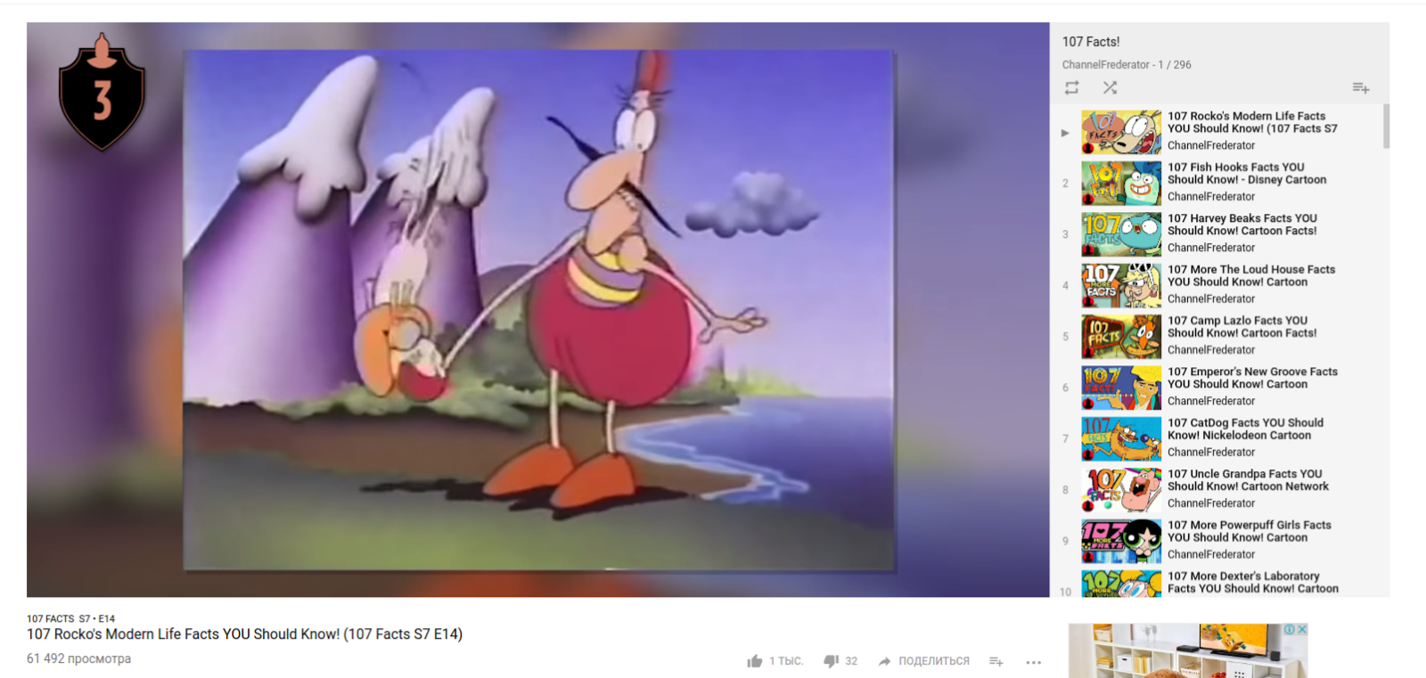 Ролики от Frederator Networks удерживают пользователя на странице более 7 минут. Это необходимо для получения топовых позиций, так как в YouTube длительность просмотра – это основной сигнал ранжирования. Серия роликов «107 фактов» специально создана для увеличения времени просмотра.