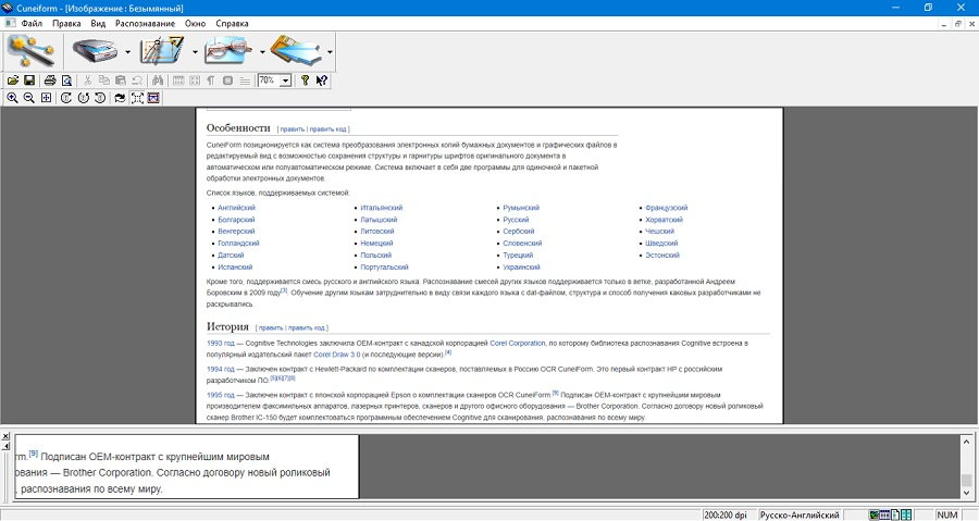 Программа для распознавания текста по фото OCR CUneiForm направлена только на одно действие – перехват со сканера изображений и преобразования содержащейся на них текстовой информации. Также допускается открытие графических файлов с персонального компьютера. После этого работу можно продолжить в любом текстовом редакторе. Разрешается работать в одиночном или пакетном режиме.