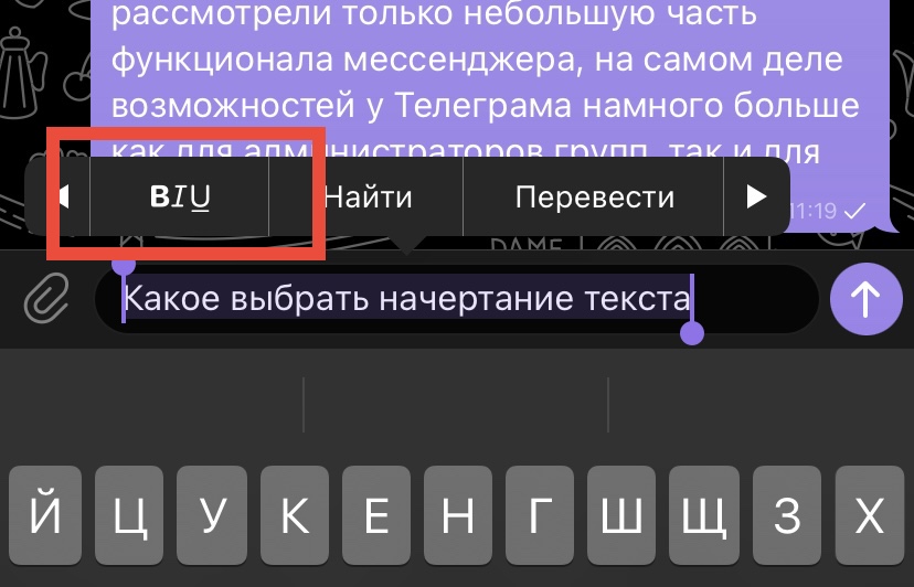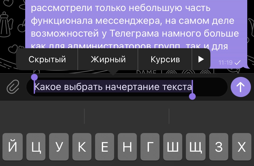 В мессенджере вы можете выбрать начертание текста самостоятельно: выделить жирным или курсивом, подчеркнуть или зачеркнуть, а также скрыть часть контента от глаз читателя. Чтобы увидеть скрытую часть, нужно просто нажать на нее, она станет доступна на несколько секунд.