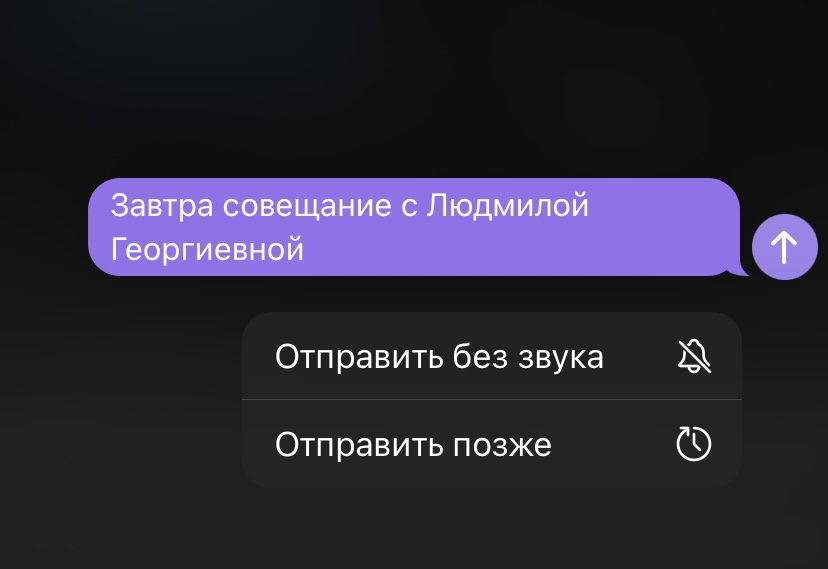 Чтобы отправить сообщение с отложенной доставкой, напишите текст и зажмите значок отправки. В открывшемся меню выберите «Отправить позже». Как раз здесь вы можете задать дату и время отправки сообщения.