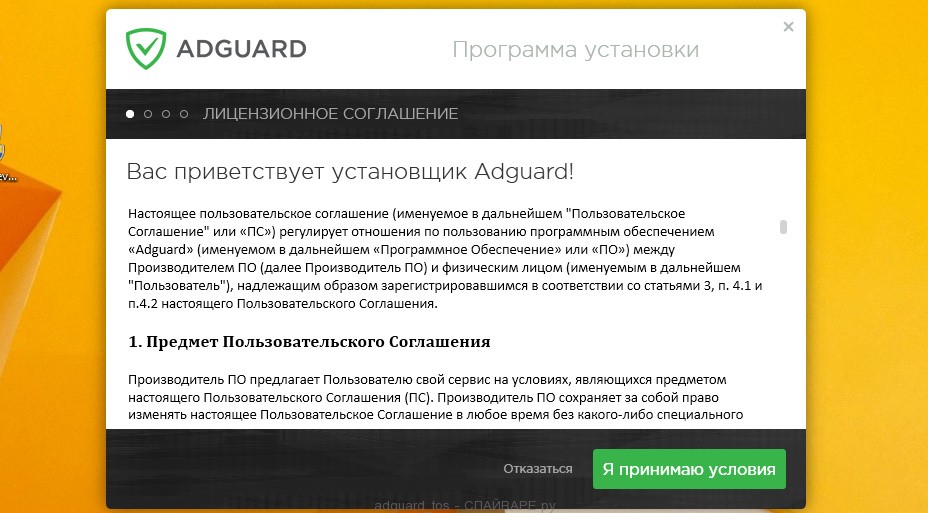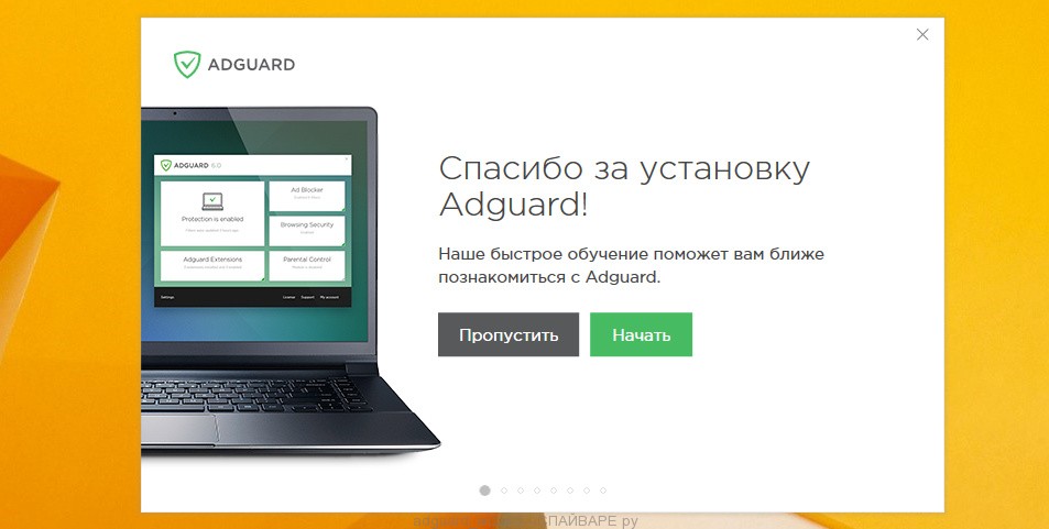 Вы можете нажать Пропустить, чтобы закрыть программу установки и использовать стандартные настройки, или кнопку Начать, чтобы ознакомиться с возможностями программы AdGuard и внести изменения в настройки, принятые по-умолчанию.