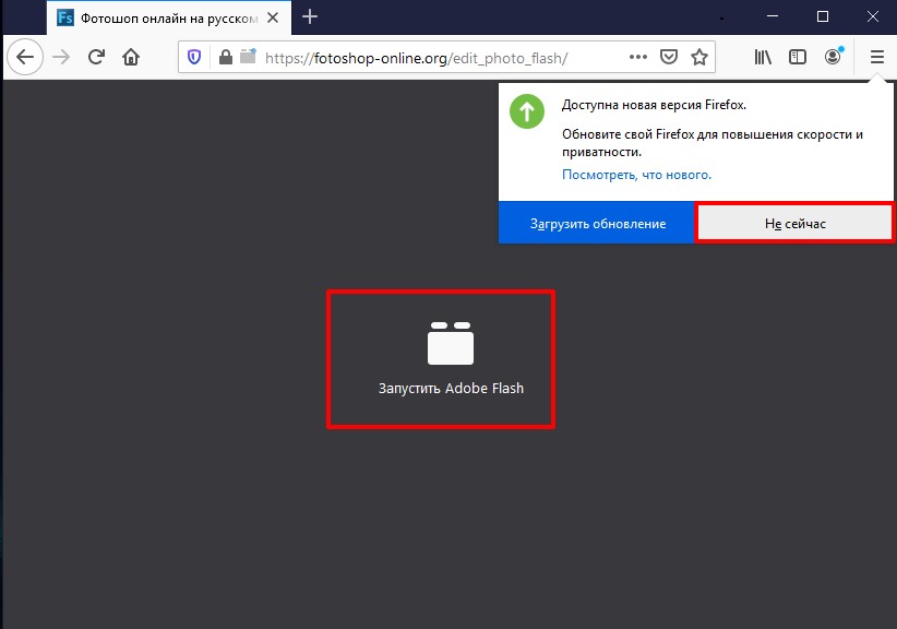 Перейдите на страницу, на которой требуется запустить фоторедактор с Flash-плеером и нажмите на «Запустить Adobe Flash», а затем «Разрешить»: