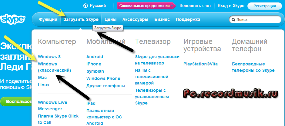 Меняем на нужный язык, я выбрал русский, переходим на вкладку Загрузить Skype. Выбираем нужное нам устройство. Недавно появилась возможность загрузки на Windows 8. В данном случае я выбрал Windows (классический), вы можете выбрать свое.
