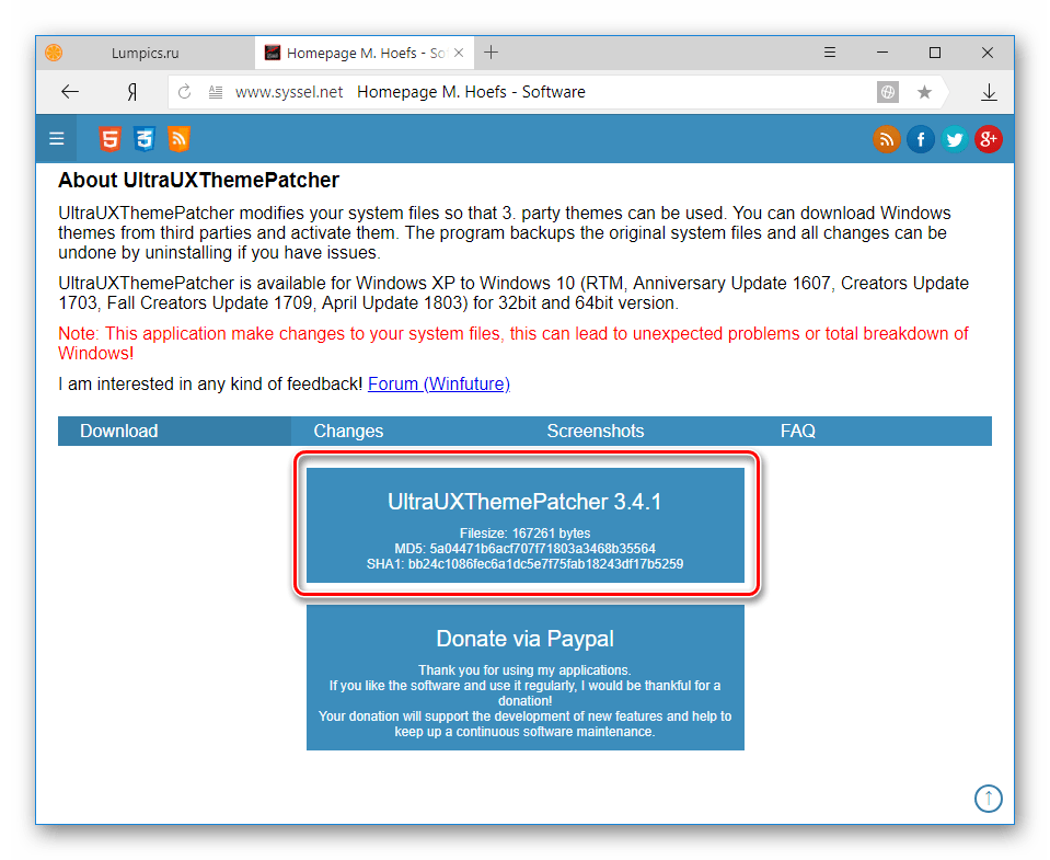 Скачать UXThemePatcher можно с официально сайта разработчика здесь: https://www.syssel.net/hoefs/software_uxtheme.php .