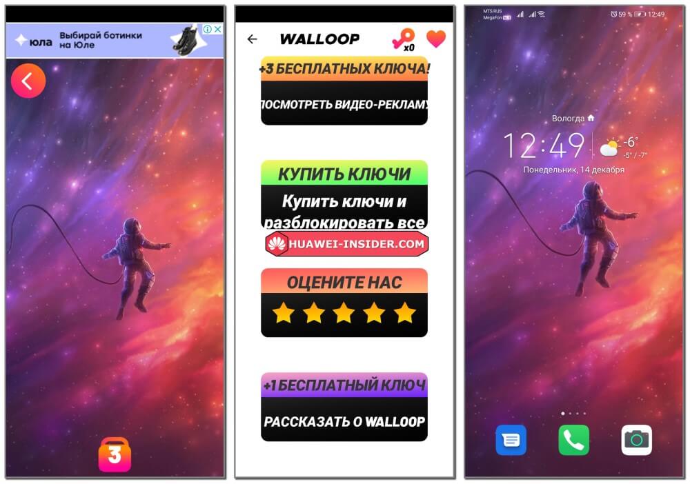 Отличное приложение, позволяющее устанавливать live hd wallpapers на Huawei и Honor. Оно предлагает огромный выбор вариантов, отсортированных по разным тематикам. Для скачивания анимированных картинок необходимы ключи, которые получаешь за просмотр рекламы, отзывы о приложении. Скромная цена за действительно качественные изображения. Также есть вариант покупки этих ключей.