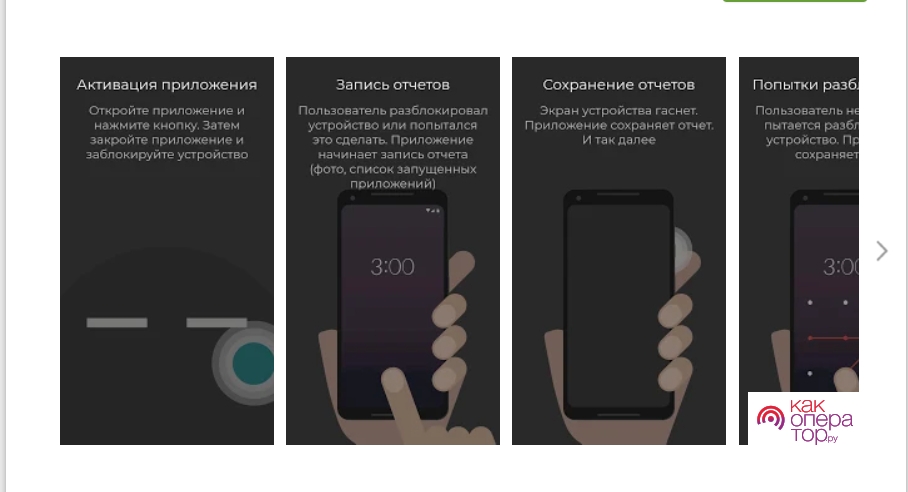 Приложение в фоновом режиме после установки формирует отчет о том, кто разблокировал устройство или пытался это сделать. При удачной попытке будет сформирован отчет того, какие приложения были запущены. В настройках дополнительно указывается синхронизация с Google-диском для удаленного просмотра информации. При установке предоставляются права администратора.