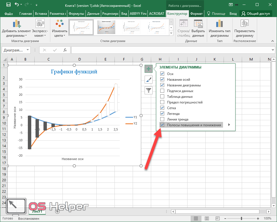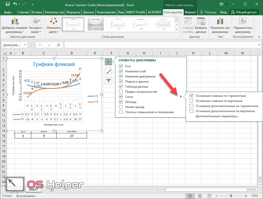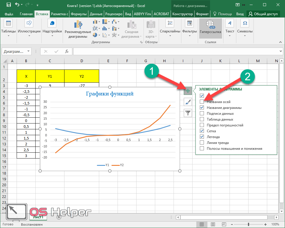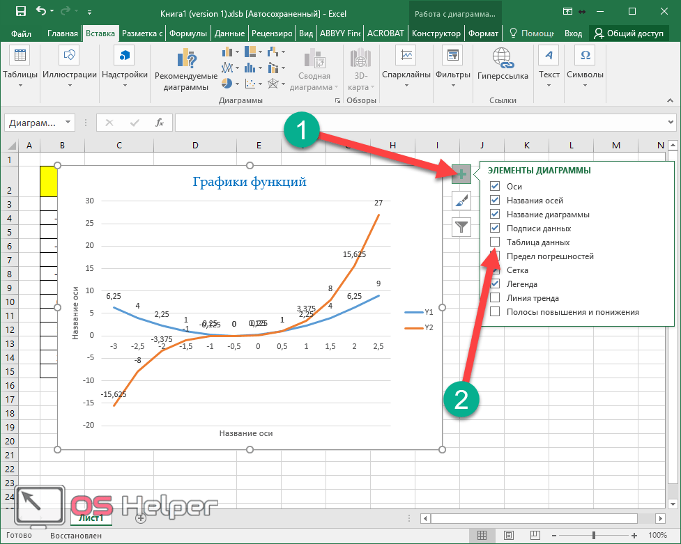- Нажмите на иконку «+» правее графика. Затем в появившемся меню поставьте галочку возле пункта «Название осей».