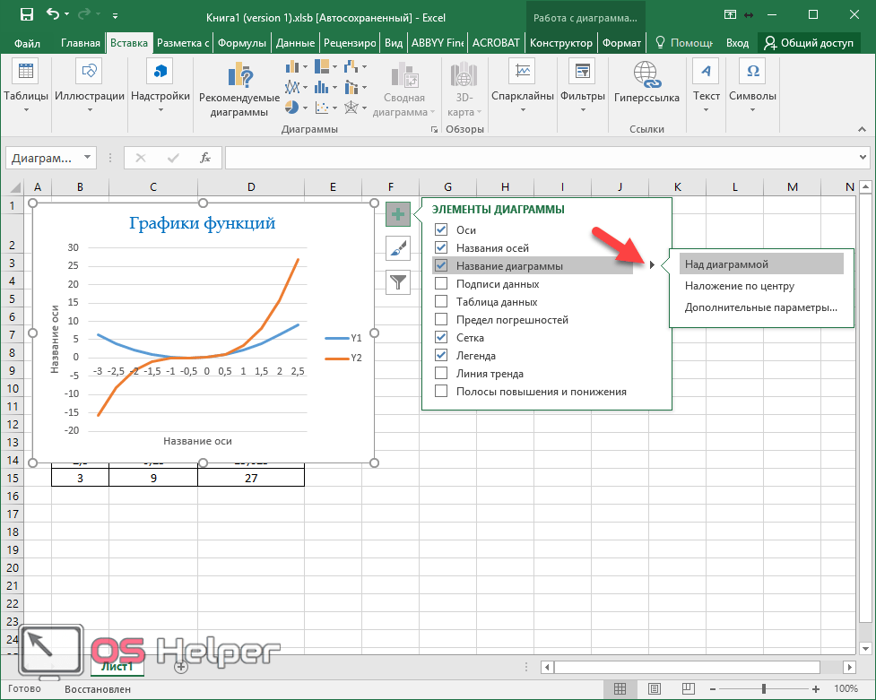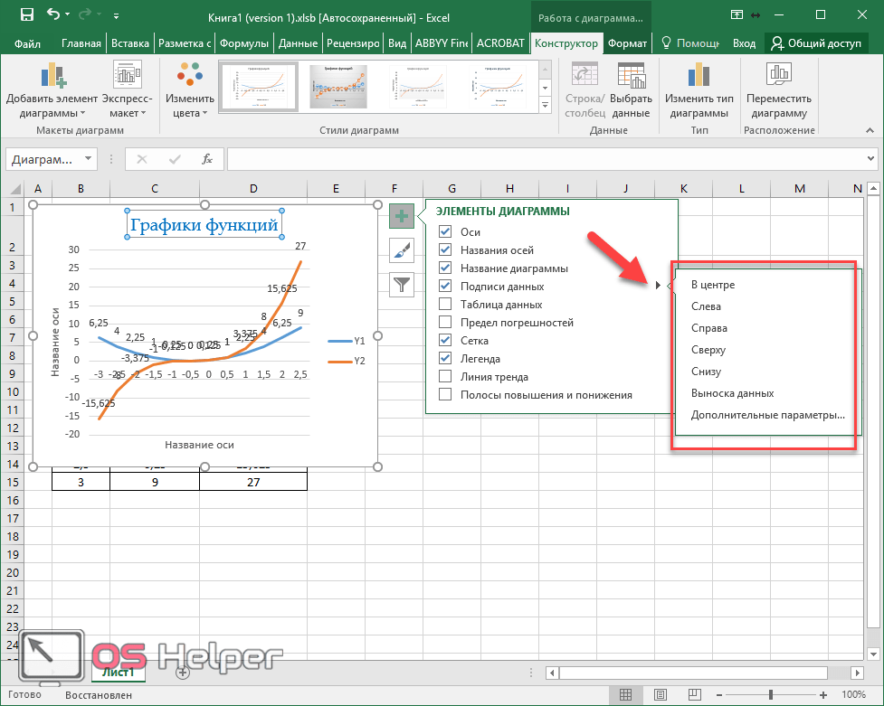 Обратите внимание на то, что напротив этого элемента есть дополнительное «подменю», в котором вы можете выбрать положение названия: