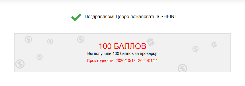 После того как вы введете данные, на ваш ящик придет письмо со ссылкой для подтверждения регистрации. В письме, помимо традиционной ссылки для перехода, вы найдете от Shein купон на первый заказ. Его размер – 100 рублей на заказ от 1000 рублей. Действует этот бонус в течение 30 дней с момента регистрации.