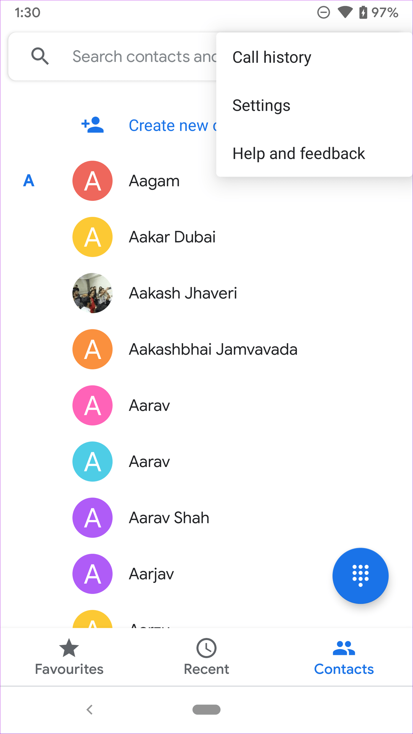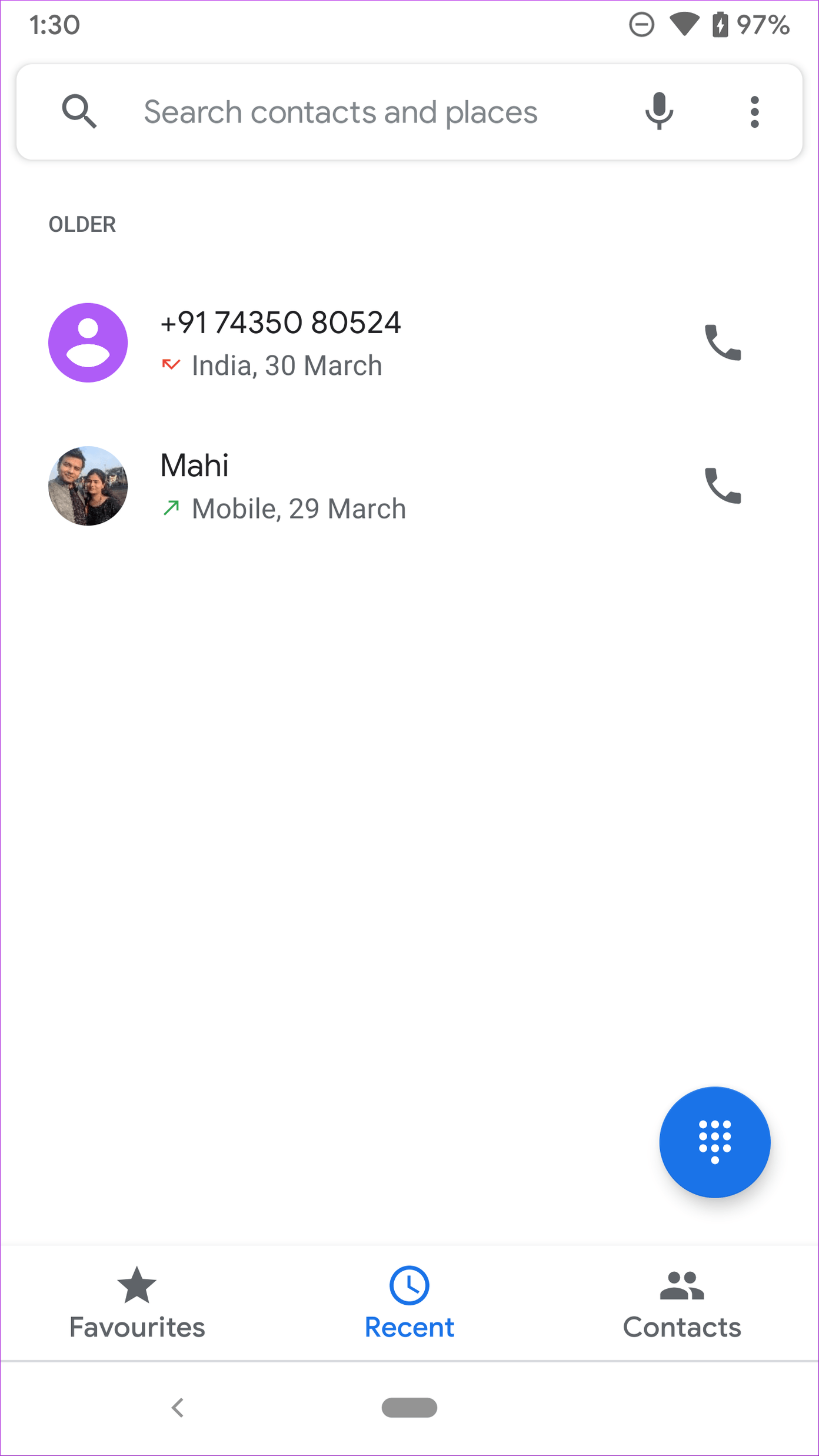 Вы можете легко добраться до избранных, истории звонков и контактов внизу. Кнопка набора номера остается неизменной в трех меню. Вы также можете переключиться на темную тему из настроек.