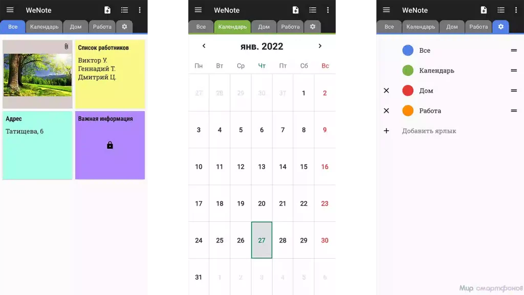 Одно из популярнейших приложений для заметок позволяет вносить информацию текстом, ручным рисованием либо через фото. При этом пользователям доступна настройка шрифтов, установка окраса карточек и напоминания. А верхние вкладки позволяют распределить элементы по категориям и даже просмотреть их в календаре для наглядности предстоящих планов. Поэтому WeNote может дополнительно выполнять роль ежедневника.