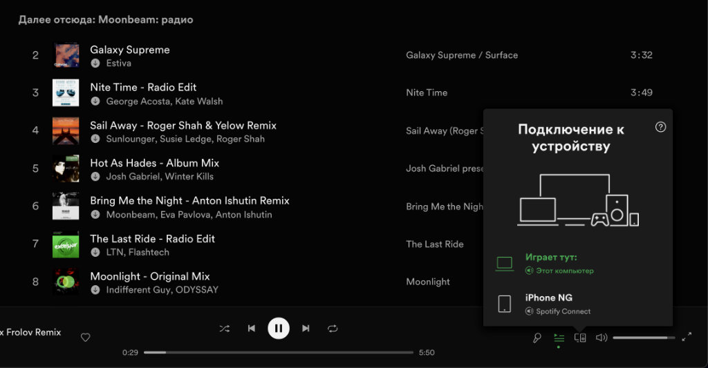 Через Spotify Connect получился ещё и переключать гаджеты, на которых воспроизводится музыка